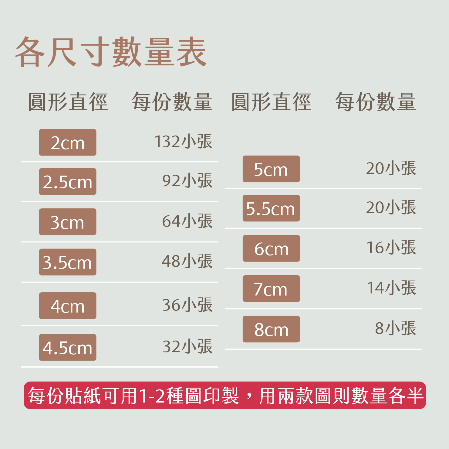 2公分-每份132小張, 3公分-每份64小張, 3.5公分-每份48小張, 4公分-每份36小張, 4.5公分-每份32小張, 5公分-每份20小張, 5.5公分-每份20小張, 6公分-每份16小張, 7公分-每份14小張, 8公分-每份8小張, 2.5公分-每份92小張